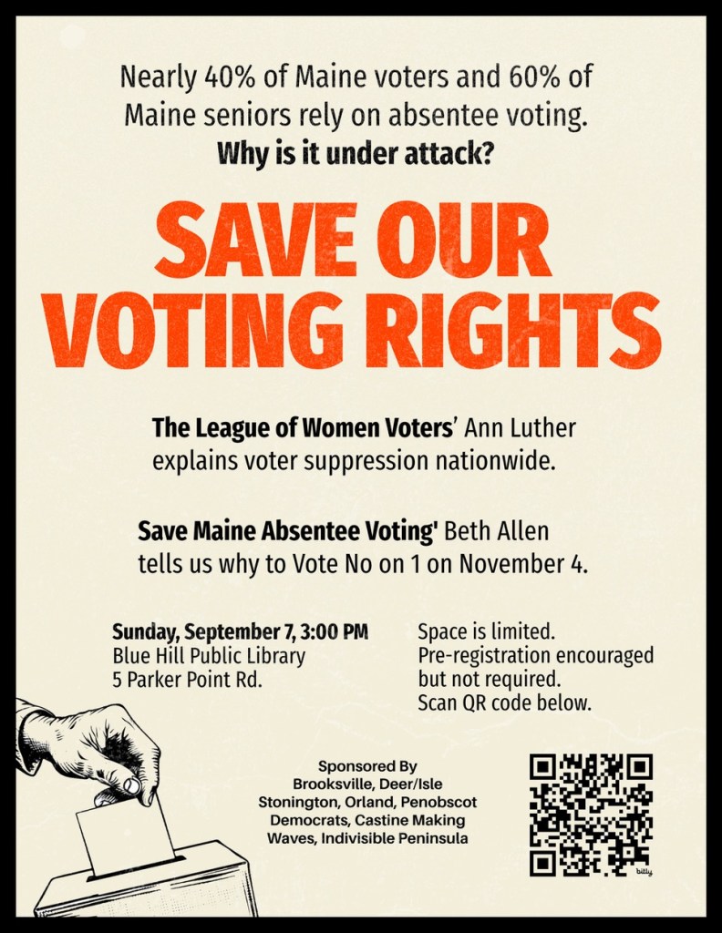 The League of Women Voters’ Ann Luther explains voter suppression nationwide. Save Maine Absentee Voting’s Beth Allen tells us why to Vote No on 1 on November 4.
