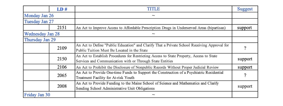 Check complete bill listing here: https://legislature.maine.gov/Calendar/#PHWS.