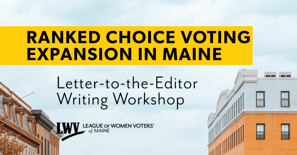 We need to demonstrate support for the expansion of Ranked Choice Voting (RCV) to include gubernatorial and state legislative elections. One key way to reach Mainers is through local newspapers. The purpose of this workshop is to guide you through the Letter to the Editor (LTE) writing process.