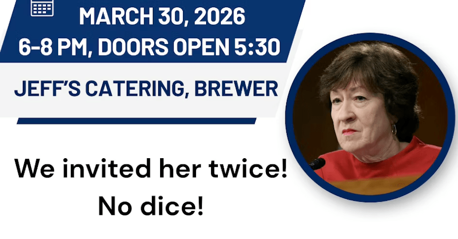 Susan Collins hasn’t held a Town Hall in over 25 years. She is supposed to represent Mainers, yet refuses to face her constituents. That’s why Indivisible Bangor, alongside many other co-sponsors, is holding one for her. Enough is enough – it’s time YOUR voices are heard. We’ve invited Senator Collins to attend twice, but we’ve received no response.
