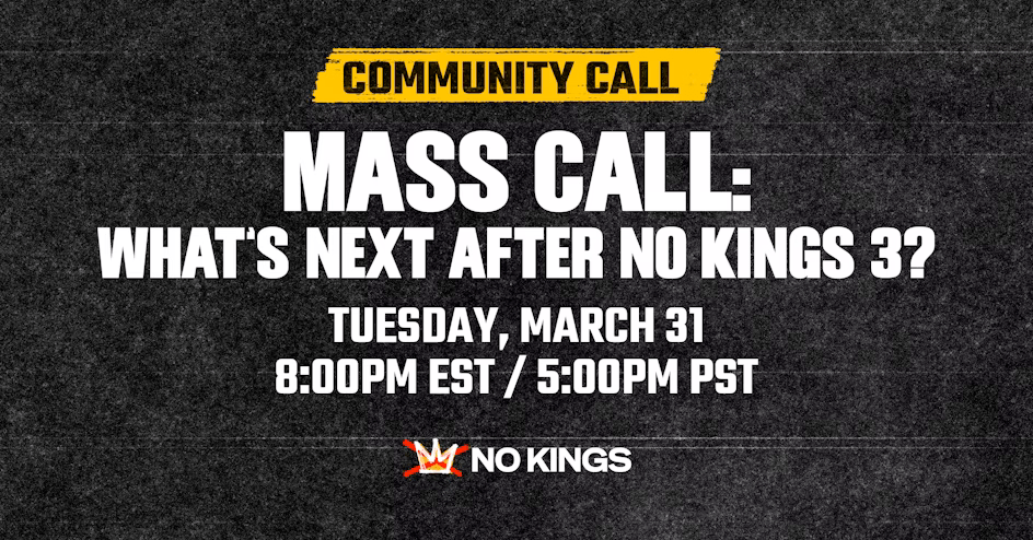 On March 28, millions of us made it clear: we don’t do kings in America. Our nonviolent movement is only growing. At our March 31 Mass Call, you’ll hear from leaders and fellow local activists to celebrate this historic mobilization and dig into what comes next. Join us.