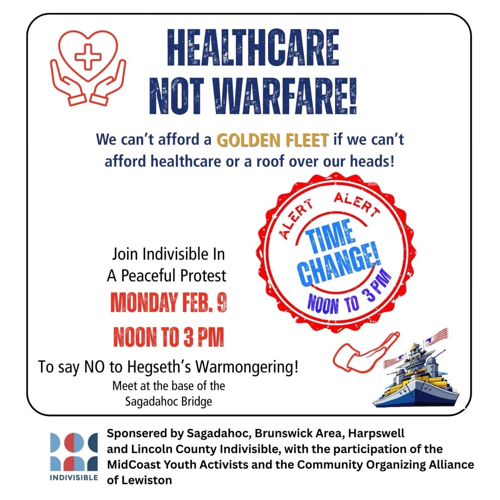 Sagadahoc, Brunswick Area, Harpswell, and Lincoln County Indivisible will hold a peaceful anti-Hegseth, anti-Trump protest on Monday, February 9, from 10am to 1pm ET, at the Sagadahoc Bridge. Please dress warmly and join us with flags and signs (some signs will be available for loan). Please consider ride sharing and park in legal spots. Parking is available on Commercial Street going up to and including Washington Street. The bridge ramp can accommodate wheelchairs, but a strong pusher is necessary. Sponsored with the participation of MidCoast Youth Activists and Community Organizing Alliance of Lewiston.