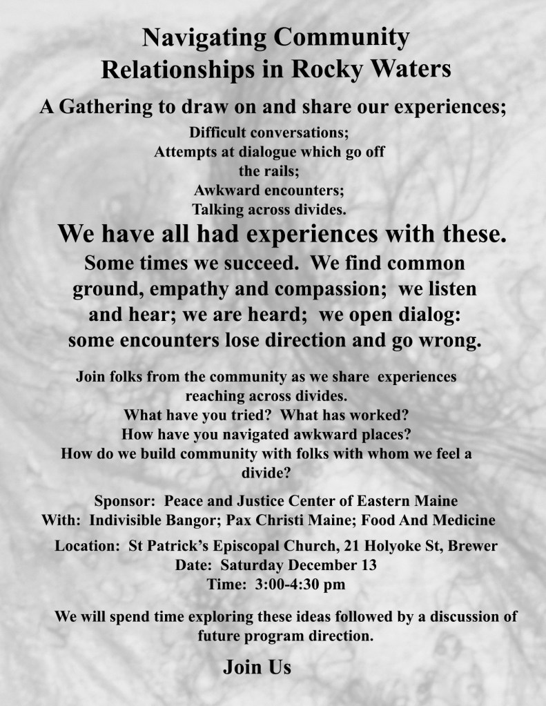 The Maine Immigrants’ Rights Coalition and partners are organizing an ICE watch Hotline in Maine. They need volunteer hotline operators to answer phones from Mainers concerned about ICE sitings. They are looking for folks fluent in one or more of the following: Spanish, French and Portugese. 207-544-9989Tuesday, December 16th: 12:00-1:00 (and every Tuesday) New Location at the corner of Main Street and Waterville Commons Drive Stand with us to Boycott Home Depot as well as support local businesses this shopping season. Check out Ice Out of Home Depot for what our demands are. We will be holding our vigil there for the month of December. See attachment below.