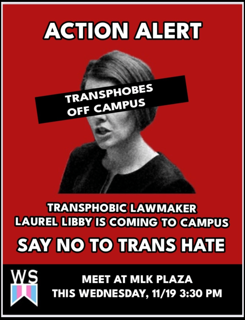 “UMaine students support our transgender community members, and Turning Point USA is sending Laurel Libby to our campus to spread hate and fear. Her event starts at 4pm in the Corbett Business Building, and we would LOVE to fill it with protestors. Not comfortable demonstrating inside? We’ll be outside too! Join us to rally in opposition to Libby and TPUSA and in solidarity for our LGBTQ+ friends, family, and community!”
